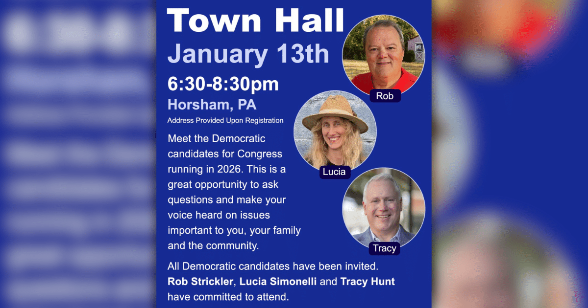 Rob Strickler, Lucia Simonelli, and Tracy Hunt will host a town hall in Horsham on Jan. 13 from 6:30-8:30 p.m. All three candidates are running for the incumbent Republican Brian Fitzpatrick’s PA-01 congressional seat in 2026, but must first face front-runner Bob Harvie in the May primary.